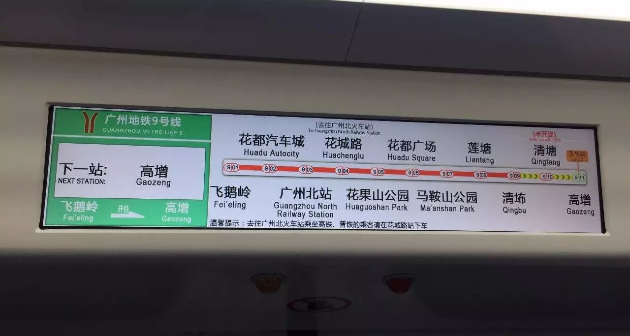 受广清城际铁路还在建设的影响,九号线广州北站目前不能直接与广州北火车站连通,九号线去往广州北火车站最近的车站是花城路站。