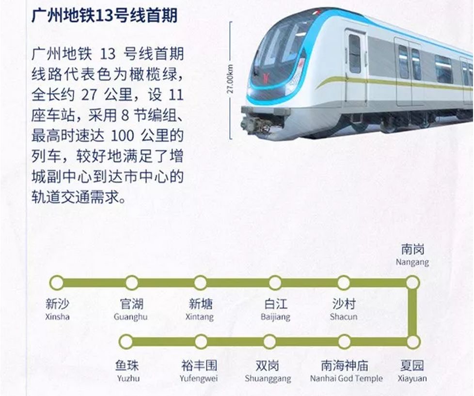 十三号线首期全长27公里,共设11座车站,线路大致呈东西走向,西起鱼珠站,东至新沙站,其中鱼珠站与五号线换乘;单程最高票价:7元。