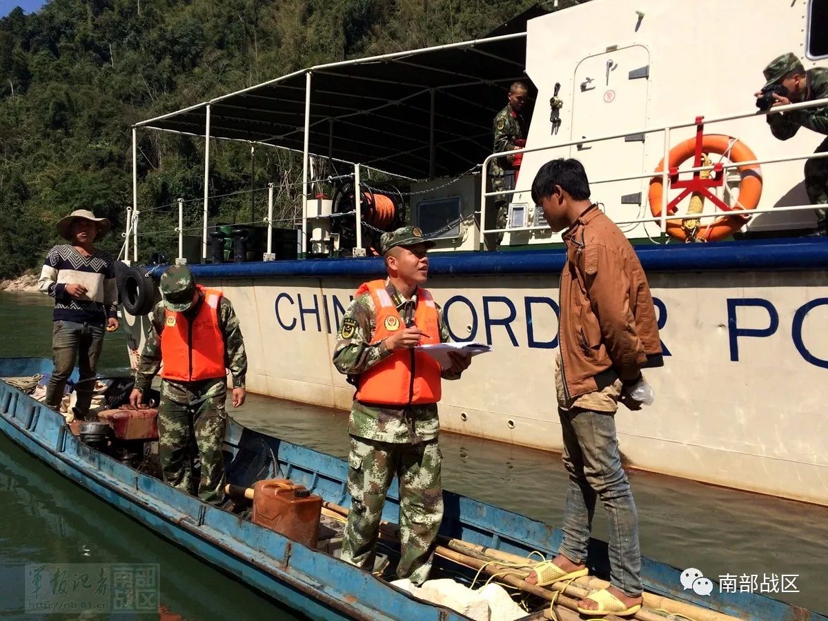 水上支队官兵检查进出湄公河的来往船只。