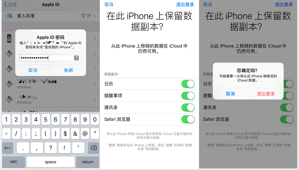 在「设置 → Apple ID」中选择退出登陆。此时需要先需要输入自己的Apple ID密码来关闭当前设备上「查找iPhone」,在选择确认之后,可以看到选择保留的在此设备上的数据副本,此处选择将所有的数据保留。