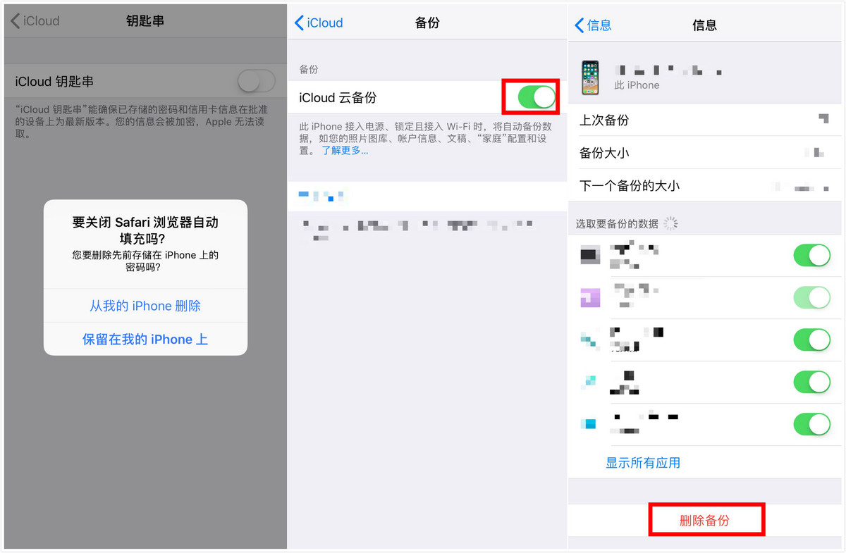 接下来,我们需要在「设置 → 账户 → iCloud → 管理储存空间 → 备份」中删除所有备份文件,并且在「设置 → 账户 → iCloud → iCloud 云备份」中关闭「iCloud 云备份」。