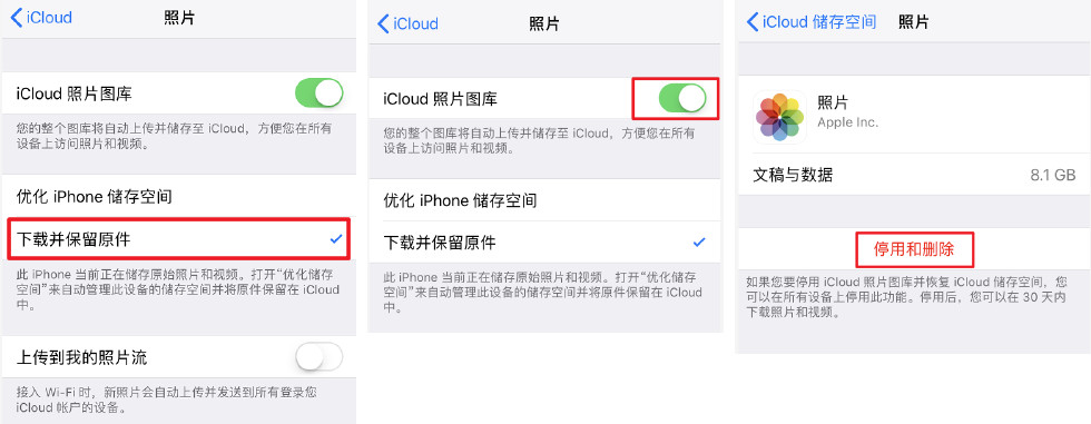完成所有照片的原件下载后,在「设置 → 账户 → iCloud → 照片」中关闭 iCloud 照片图库,此时所有的照片就变成了此设备上的本地数据。之后,在「设置 → 账户 → iCloud → 管理储存空间 → 照片」中选择「停用和删除」。此举在30天后清空此 Apple ID 中所有储存在云端的照片。
