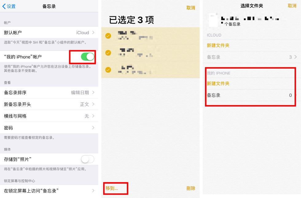 如果你在使用 iCloud 的备忘录,则需要进行以下的备忘录转移操作。首先,在「设置 → 备忘录」中打开「我的 iPhone 账户」,其次,进入手机备忘录应用,选择所有保存在 iCloud 的备忘录,并将其移动到「我的 iPhone 账户」中。