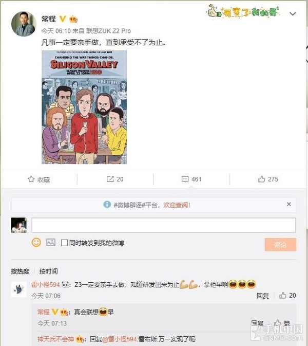 近日常程再次在微博上表示:“凡事一定要亲手做,直到承受不了为止。”配图上有一个英文日期“4月23日”让人很容易忽略,好在1级英语水平的小编艰难地认了出来。这个日期应该在国内首发骁龙845的小米7之后,很有可能就是同样采用骁龙845移动平台的ZUK旗舰新机,如果这个猜测属实,就非常值得期待了!