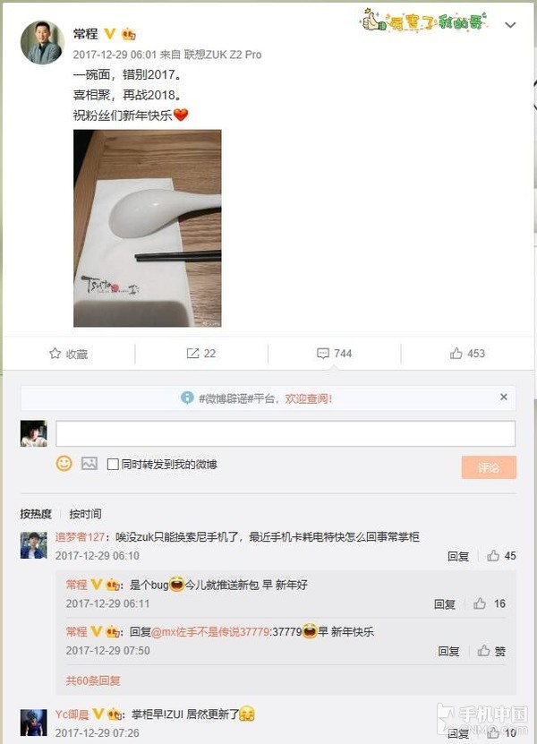 在去年年底,准确说应该是一周前,联想集团副总裁常程在微博上用ZUK Z2 Pro手机发了一段话:“一碗面,错别2017。喜相聚,再战2018。”暗示了ZUK手机即将复活。评论中有ZUK Z2网友说手机很卡,常程居然回复说,那是个bug,今天就推送系统更新!试问:谁见过一家消失的手机厂商还给你更新系统?