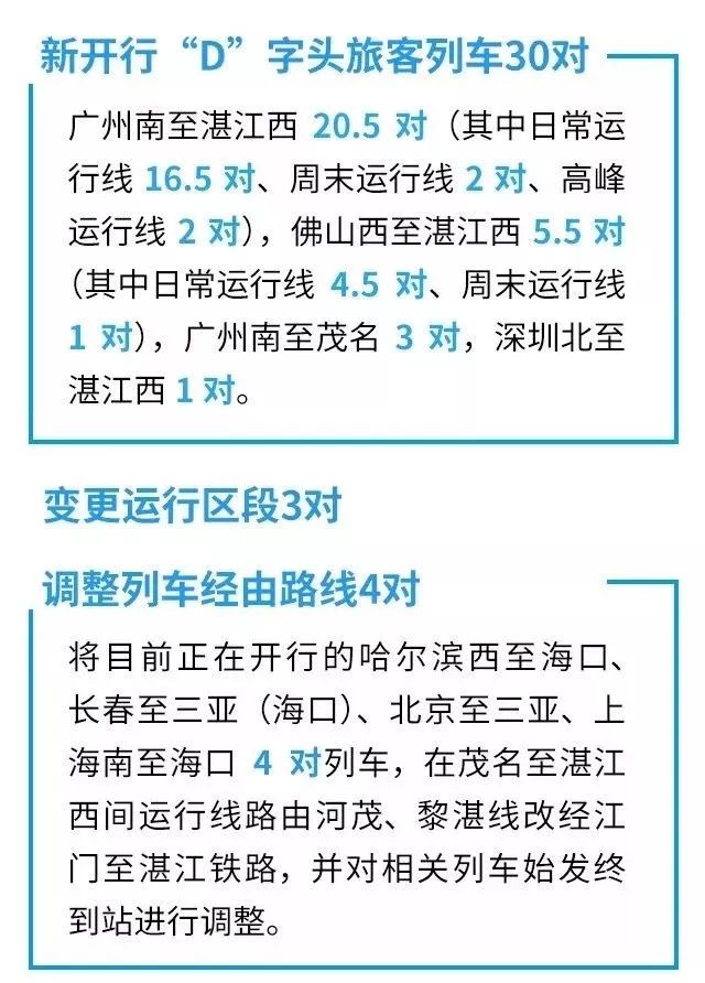 江湛铁路开通初期,将安排新开行D字头旅客列车30对,其中,深圳北至湛江西D7754/1次,逢每周四、五开行,早上6:39分从深圳北站始发,途经广州南、新会、开平南、阳江、茂名等站点,于上午10:44分到达湛江西,历经4小时05分。 湛江西至深圳北D7552/3次,逢每周二、周四开行,下午16:00从湛江西始发,于晚上20:03分到达深圳北。小编在12306官网看到,目前只有二等座,暂无其它座别可选。