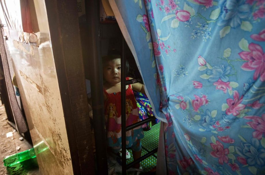 小女孩从叔叔家的蜗居向外看。