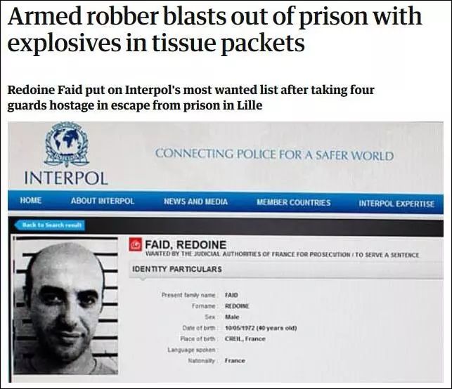 《卫报》2013年法伊德第一次越狱的报道截图,法伊德越狱后被列入国际刑警组织的通缉名单。