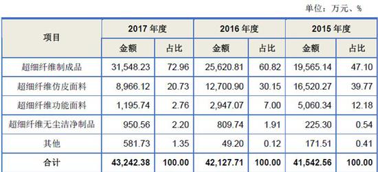 数据显示,聚杰微纤2015年-2017年超细纤维仿皮面料产生的销售收入分别为16520.27万元、12700.9万元、8966.12万元,占当期营业收入的39.77%、30.15%、20.73%,为其第二大产品。