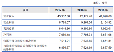 招股说明书显示,聚杰微纤2015年-2017年的营业收入分别为41628.6万元、42179.4万元、43337.8万元,年均复合增长率为2.03%。
