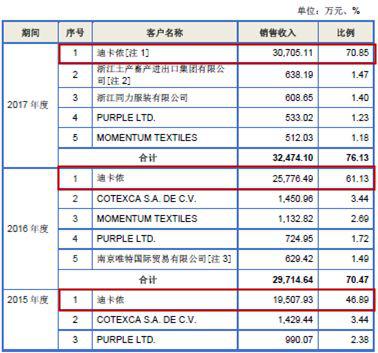 数据显示,聚杰微纤2015年-2017年对迪卡侬产生的销售收入分别为19507.93万元、25776.49万元、30705.11万元,占当期营业收入的46.89%、61.13%、70.85%,呈现持续上升的趋势。