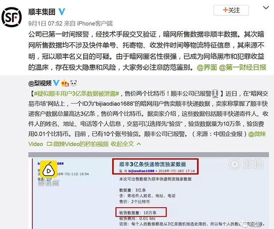 顺丰对“3亿条顺丰快递客户数据泄露”传言的回应 来源:微博