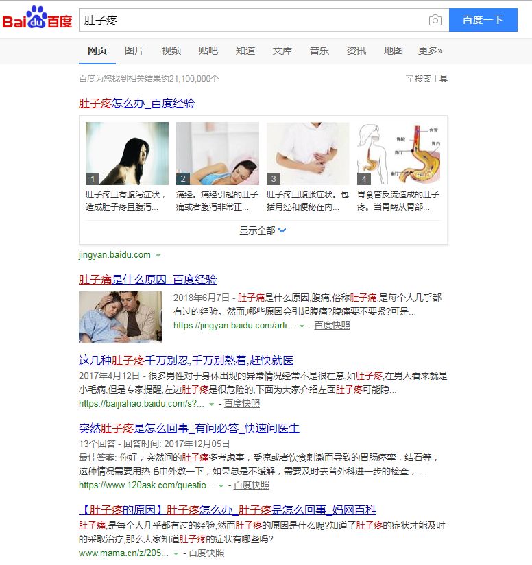 另外,网友吐槽的搜“肚子疼”出人流广告的现象也已经改正,“肚子疼”搜索结果首页前几条依次为“肚子疼百度经验”、“肚子疼快速问医生”、“肚子疼百度知道”等。不过,当记者搜索“北京市体检中心”时,首页前五条信息均为民营体检中心广告,第六条才是记者想要的内容。