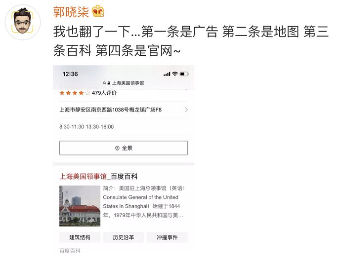 前天17点左右,记者在百度上搜索“上海美国领事馆”,置顶第一条已经变更为正确地址,而且接下来的几条均为相关服务信息,包括签证主页、上海美国领事馆百度百科、上海美国领事馆百度地图等,六六在微博中展示的广告、骗子链接已不见踪影。