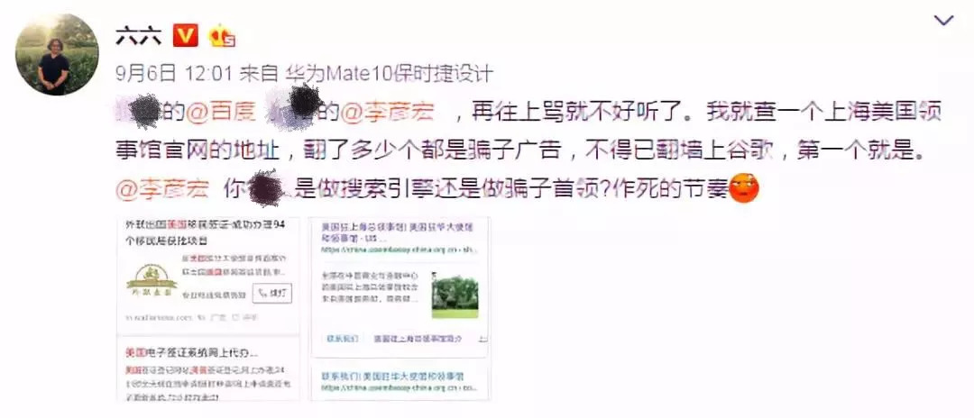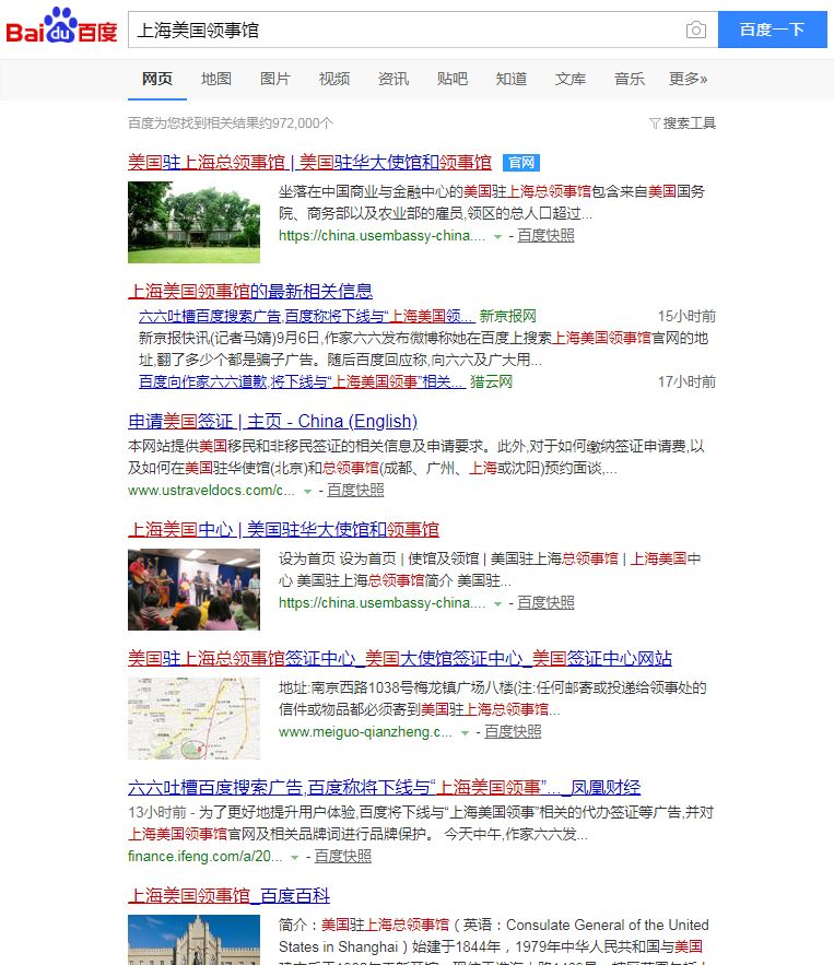 女作家六六称她在百度上查找上海美国领事馆官网的地址,搜索出来的全是广告,搜上海美国领事馆官网,出来的都是骗子链接,最后不得已上谷歌,在谷歌上搜索出来的第一个就是正确地址。