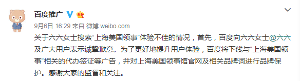 面对六六发帖,百度立即做出回应,向六六及广大用户表示诚挚歉意。在回应中百度还称,为了更好地提升用户体验,百度将下线与“上海美国领事”相关的代办签证等广告,并对上海美国领事馆官网及相关品牌词进行品牌保护。