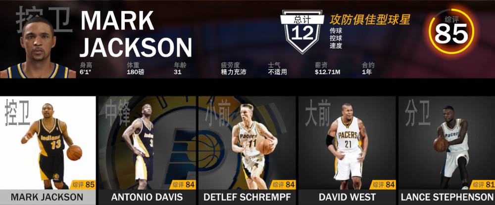 替补:乔治-麦金尼斯(89)、奥拉迪波(88)、查克-珀森(87)、贾伦-罗斯(86)、赫伯-威廉姆斯(85)、克拉克-凯洛格(85)、安东尼奥-戴维斯(84)、德特雷夫-施拉姆夫(84)、大卫-韦斯特(84)、兰斯-史蒂芬森(81)