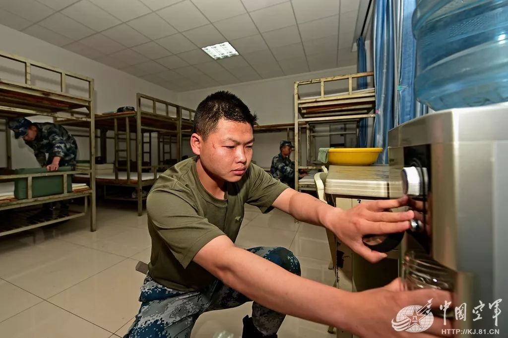 饮水机是官兵宿舍中的标配。上等兵陈攀正在接纯净水。