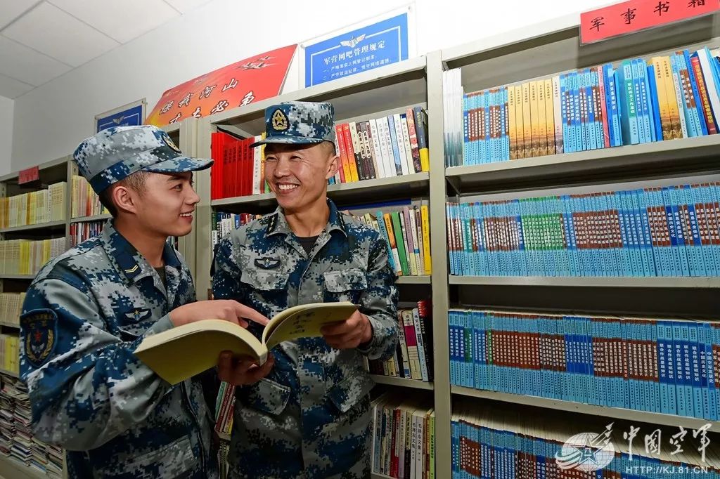 官兵边整理图书边如饥似渴地学习。
