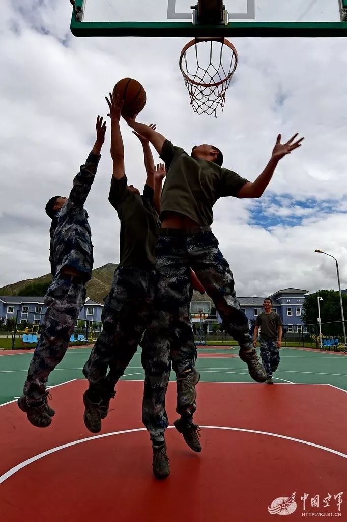 官兵在塑胶篮球场上激烈拼搏。