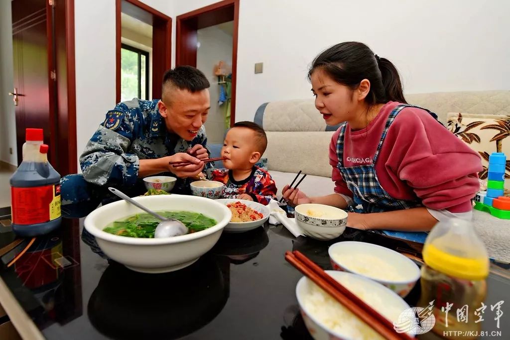 某边防一线雷达站战勤分队长、上士戴云松一家三口在“鸳鸯楼”吃团圆饭。