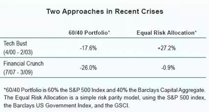上述结果并不只是在科技股泡沫破灭和金融危机中才有;60/40投资组合比风险分散投资组合在市场崩盘的时候表现更差。即使最终结果并不是一个完全风险平衡的投资组合(右图),但沿着这一思路所做的任何操作都可能会减少投资组合的整体尾部风险。