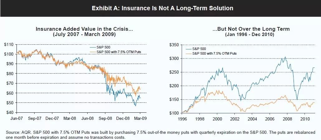 金融市场不是正态分布的,尾部风险也确实存在。投资者确实应该重点关注尾部风险,因为大量的短期损失会阻碍组合达到长期收益目标,这不只是因为复合收益率计算的原因,而是短期的损失会诱使投资者采取错误的投资行为。然而,通过购买保险来防范尾部风险却是目光短浅的行为,也不是正确的长期投资政策,原因有以下几点:需要被保险的规模并不是一个不变的数字;保险费用是投资组合长期表现的负担;当保险的需求量激增时,保险费用会提高。[8]