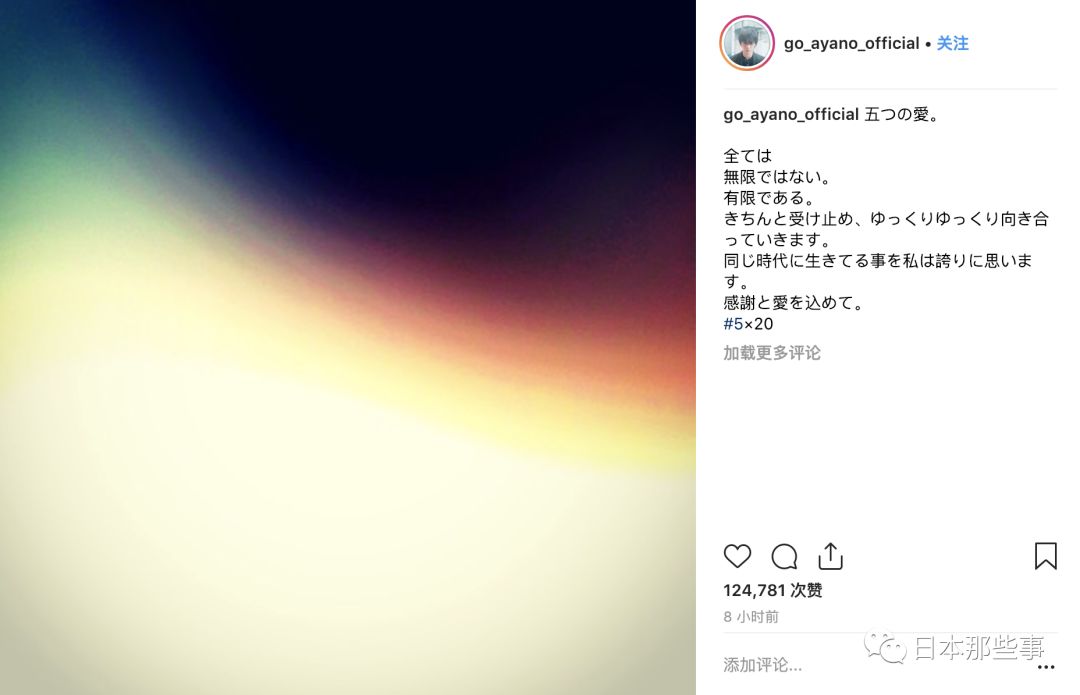 曾经说过想加入岚的绫野刚也在Instagram上连发两个帖子支持岚:“世间的一切都有终结。恰到好处的停下,慢慢的调整脚步。和他们生于同一个时代是我的骄傲。包含着感谢和爱意 #5x20”