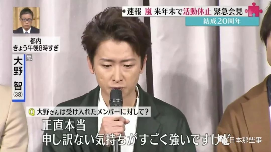 大野智:说真的我觉得非常对不起他们,但是因为我们5人都强烈的认为只要缺了一个人就不再是岚了,虽然有些自说自话地设置了期限,到2020年为止我也会抱着珍惜成员的心情每一天都认真的度过。