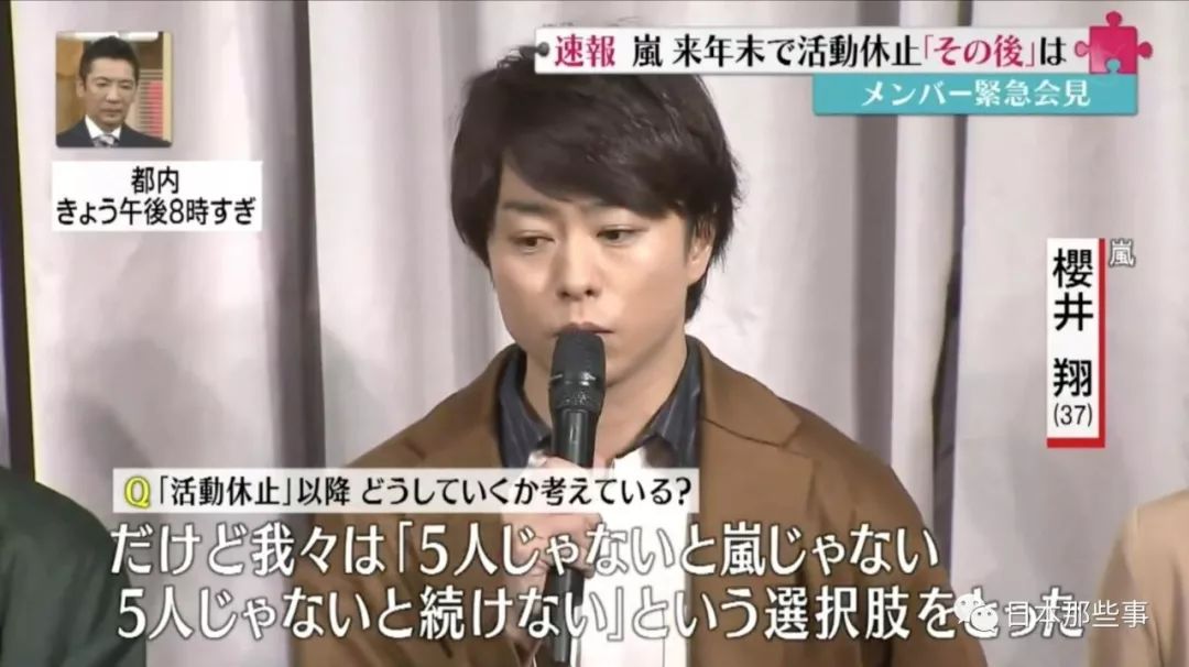 樱井翔:作为团体,当然会有“就算一两个人休息也是岚”的选项,但是我们选择了“不是5个人的话就不是岚,不是5个人的话就无法走下去”的选项。我现在满脑子都是岚2020年12月31日的事情,在之后自己一个人要如何走下去还想象不出来。现在满脑子想的都是岚。