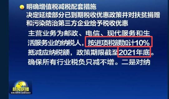 3、对主营业务为邮政、电信、现代服务和生活服务业的纳税人,进项税额加计10%抵扣,政策期限截止到2021年底。