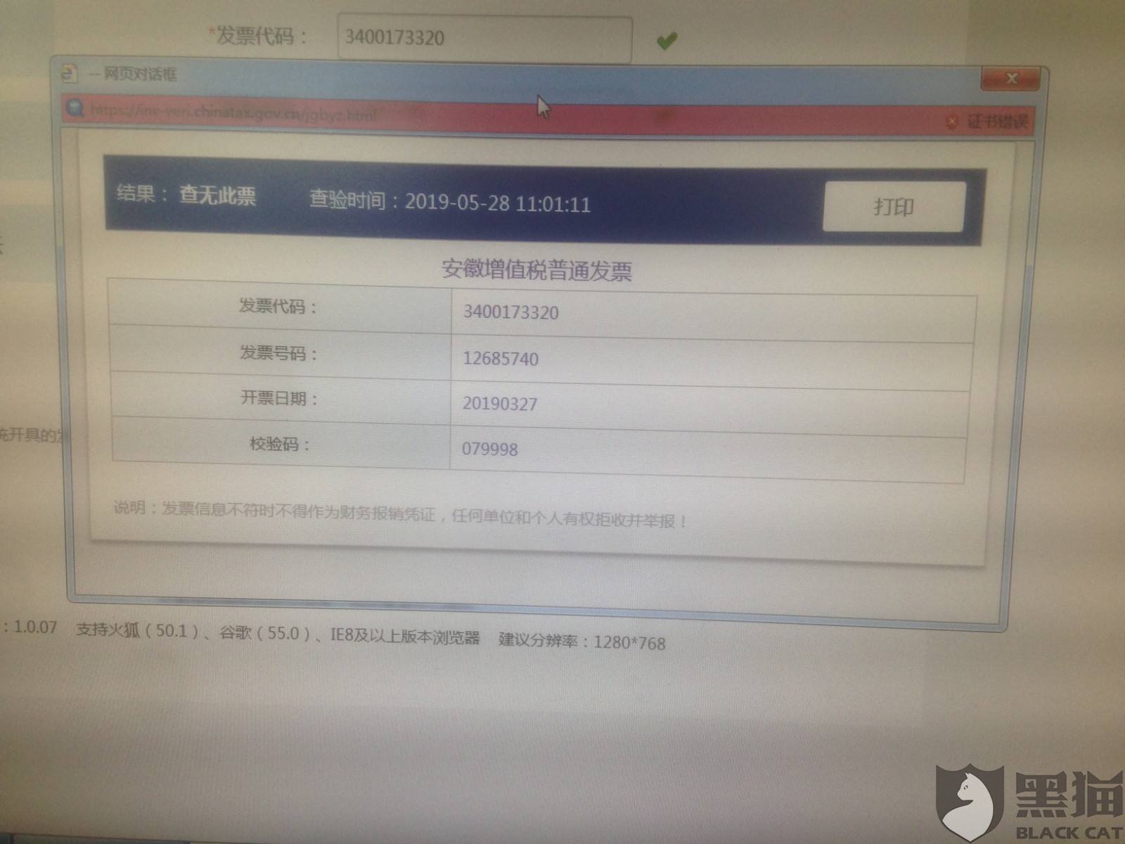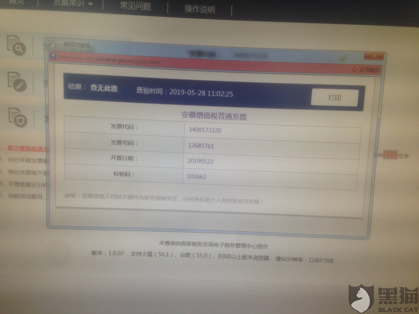 消费者“LinusZ”在5月29日向黑猫投诉平台反映:“我于19年3月21日在卖家处购买物品并在购买前与卖家沟通是否可以开发票,卖家表示加50可以开,于是原商品价格由原来240修改为290。 4月初我收到货物以及发票后确认收货,当我拿着发票去财务报销时,财务确认发票无法在税务系统中查询到,我立即联系卖家,卖家说发票没问题,我多次和卖家联系,但卖家最终没给一个说法。后续直至订单无法维权。 期间我一直联系卖家,卖家也承诺给我重开发票。直到5月14日,卖家提出再给50,可以重开发票。我考虑到没有发票我无法报销,就同意。当日完成下单。 25日我收到发票,并在税务总局系统查询,发现发票无法查询,立即联系卖家,卖家无法给出答复。由于发票快递从深圳寄出,而非发票开具地以及卖家所在地合肥,我开始怀疑发票为假发票。经过税务局朋友确定,该发票存在很大的疑点,应该是假发票。 5月28日我联系淘宝客户介入此事,但客服一直不正事假发票问题。”