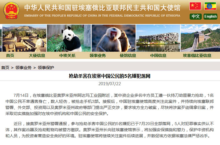 接报后,中国驻埃塞使馆高度关注此案件,并持续向埃塞联邦警署、外交部、投资局以及奥罗米亚州政府等部门提出严正交涉,要求埃方全力破案,尽快将涉案歹徒缉拿归案,并采取切实措施加强对在埃中资机构和中国公民的安全保护。
