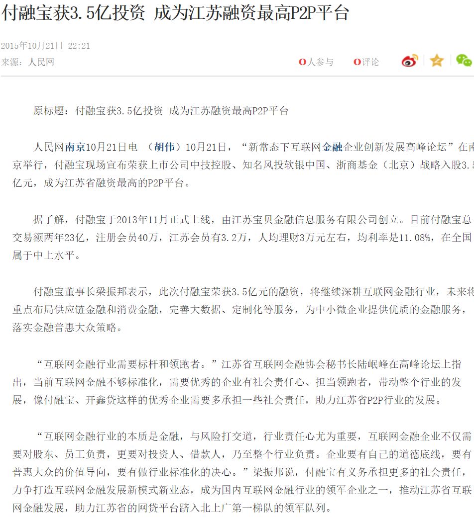 凭借自己的关系网,梁振邦在2015年就宣布付融宝获得上市公司中技控股、知名风投软银中国、浙商基金(北京)战略入股3.5亿元,成为江苏省内融资最高的P2P平台。