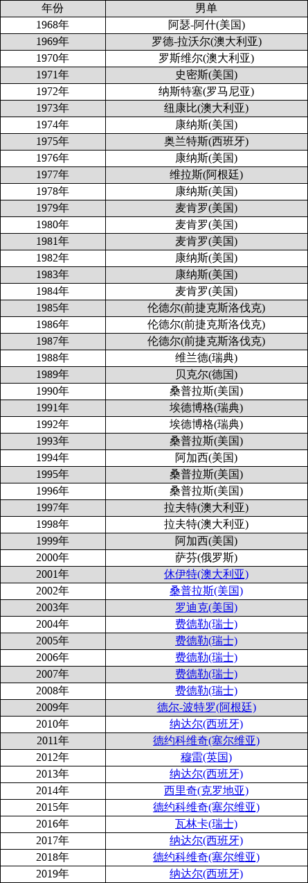 以下是美国网球公开赛自1968年进入公开赛阶段起的历届男单冠军榜: