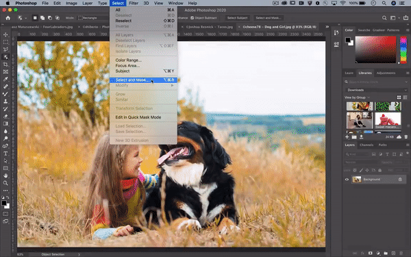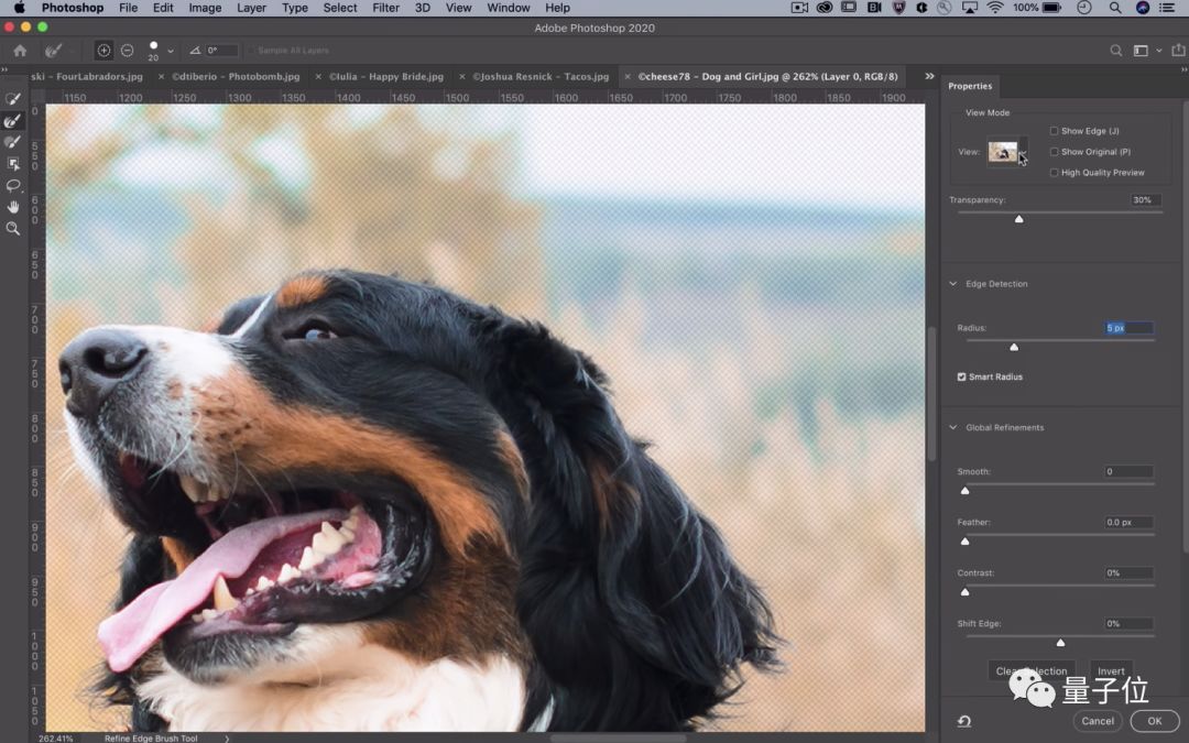 还是用选框框住狗狗,蒙版就创建好了,再微调一下边缘半径,你就得到了一只毛发细节柔顺自然的狗狗。