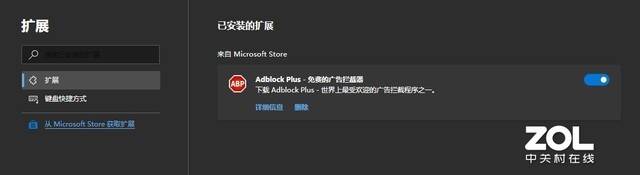 既然是基于Chrome浏览器内核打造,那么Edge Canary自然支持插件。目前微软的插件商店已经上线,通过Edge Canary右上角的菜单栏“扩展”选项进入扩展界面,之后再点击左上角的“从Microsoft Store获取扩展”文字链来进入插件商店。