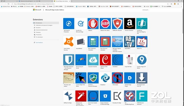 进入Chrome应用商店的话,中国用户需要通过科学上网的方式来实现,微软插件商店目前可以正常进入。不过与Chrome插件数量对比的话,微软商店中的插件数量并不多,满打满算只有128款。不过我大概浏览了一遍,常用的插件都有,比如Adblock Plus、McAfee WebAdvisor等。另外,微软插件商店的响应速度非常快,网络质量极佳。