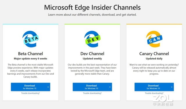 本次测试主角是基于Chromium打造的新款Edge浏览器,采用了与Chrome浏览器相同的Webkit内核。新款浏览器像Chrome一样提供了三种不同激进程度的版本,分别为Beta版,Dev版以及Canary(金丝雀)版,如下: