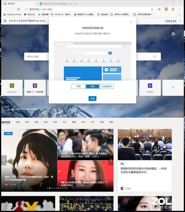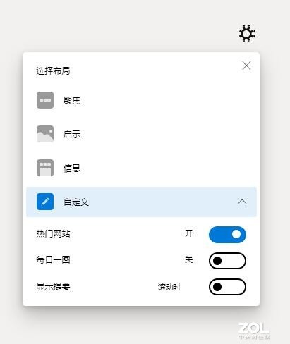 如果没有在开始界面设置页面风格也不用担心,后续可以通过空白页右上角的“小齿轮”图标的下拉菜单来进行调整。微软给出了三种默认风格,包括聚焦、启示和信息,另外还可以根据自身喜好进行自定义,不过现在这个功能还不是太过完善,能够设置的选项就是热门网站、每日一图(相当于浏览器的壁纸)和显示提要三项。