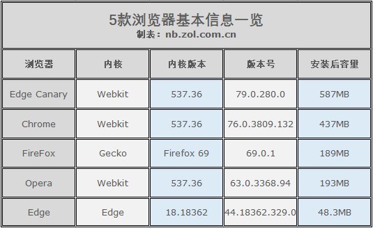 本次我们选择了最为激进的Edge Canary版本进行测试,另外还选择了Chrome、Edge、Opera、FireFox四款浏览器做参照。下面是这五款浏览器的基本信息: