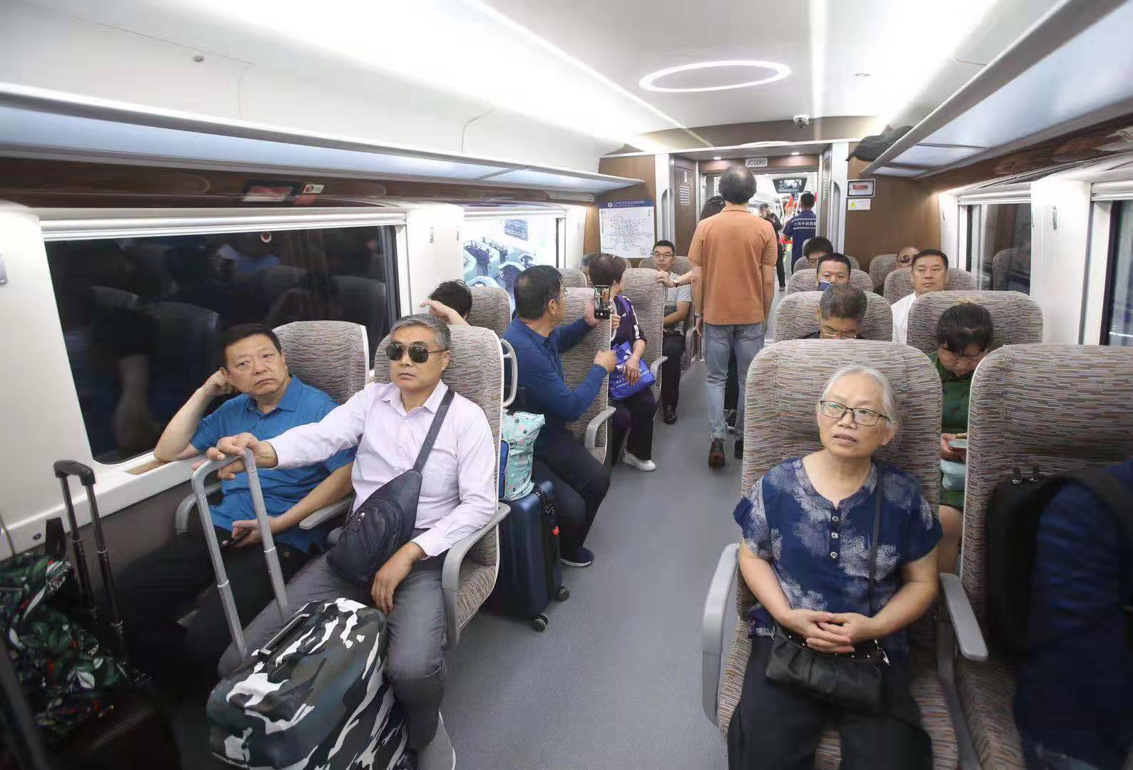 车厢内空间宽敞,座椅尺寸和间距超过复兴号高铁动车组二等座和一等座的要求。新京报记者 王贵彬 摄