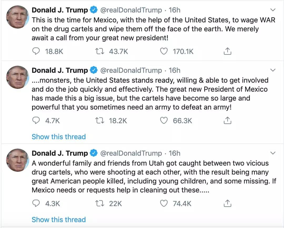 特朗普喊话墨西哥总统对贩毒集团发起战争。图/推特截图