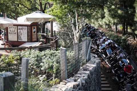 没有满员的过山车经过一处关闭的小卖部。