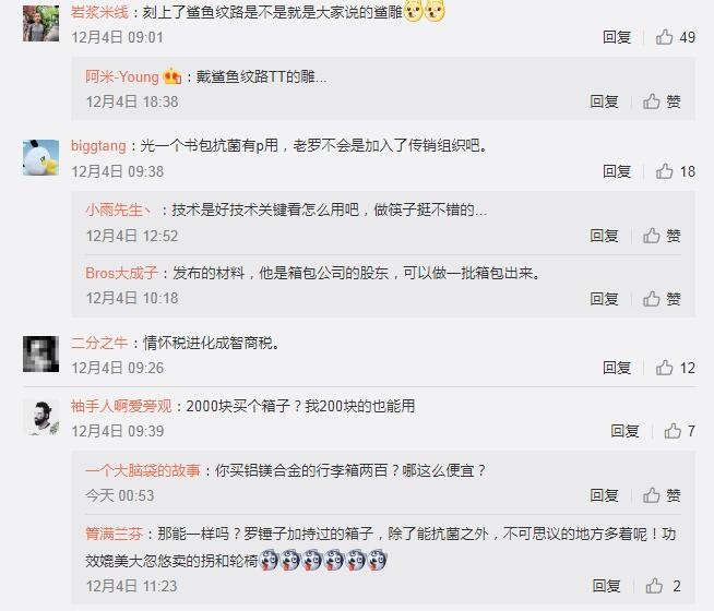 有个别网友表示,自己以前买个鲨纹抗菌手机壳都掉皮掉色得厉害,这回还要用在背包、旅行箱和衣服什么的上面,不翻车才怪……这让不少网友看完发布会又一次有感而发:“看着像智商税产品”“大概抑菌材料行业要凉了……”