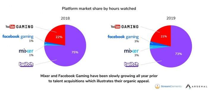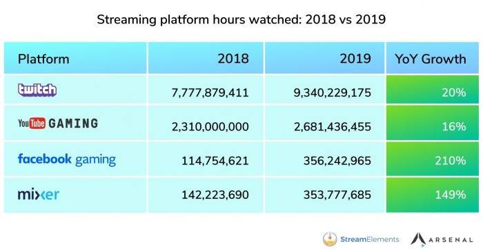 当然,值得注意的是,就总观看时间而言,所有平台都在2019年实现了增长,这是一个相对较新市场的自然结果。作为市场上最小的玩家,Mixer和Facebook Gmaing的增长百分比最大,YouTube增长最少。