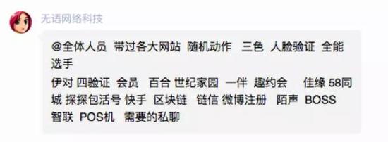 “代过各大网站,随机动作,人脸验证,全能选手,需要的私聊。”在一个近500人满员内部社群里,一位昵称为“五八网络科技工作室”的卖家不停吆喝着。