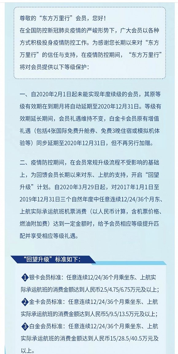 值得注意的是,东航还推出了一个“回望升级”计划。指出在疫情防控期间,会员常规升级流程不受影响,即还可通过航段和里程来升级。同时对一些出行频率较低,但购买票价高的旅客,可通过“回望升级”计划保级或升级,并享受相应等级的礼遇。