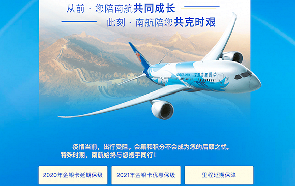 南航推出的《客户关怀计划》,内容涵盖了金银卡延期保级、金银卡优惠保级和里程延期保障的政策。