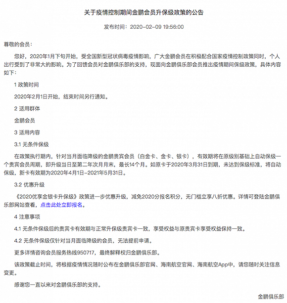 2月9日晚,海航也推出了针对2月面临降级的金鹏贵宾会员的免费保级政策。表示白金卡、金卡、银卡会员的会籍有效期将在原级别基础上自动保级一个贵宾会员周期(即到第二年次月月末,最长达14个月)。